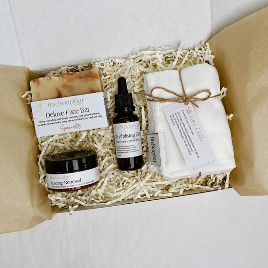 The Soap Bar Luxury Skin Trio pack contains three of our most popular skin care products and as an added bonus, our silk face cloth, all presented in a gift box: